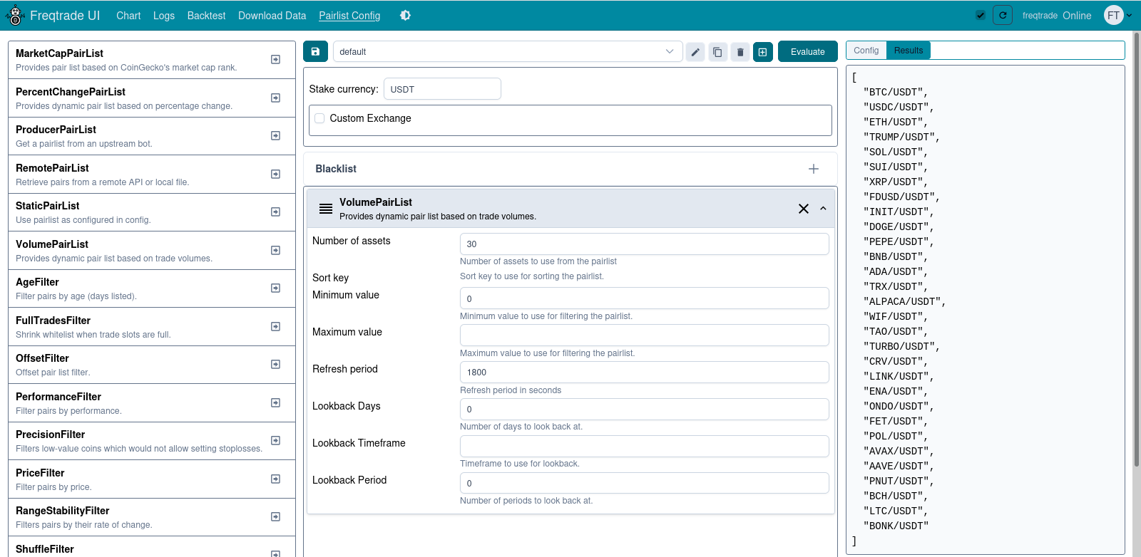 Cet article explique comment configurer une pairlist dynamique dans l’UI de Freqtrade. Il détaille les raisons de l’utiliser (réactivité, performance, gain de temps), présente les différentes méthodes de sélection disponibles (VolumePairList, PercentChangePairList, etc.) ainsi que les filtres applicables (AgeFilter, SpreadFilter, VolatilityFilter, etc.). Un exemple concret avec VolumePairList illustre la procédure pas à pas pour ne trader que les 30 paires USDT les plus actives sur Binance, actualisées toutes les 30 minutes. Enfin, il montre comment combiner plusieurs configurations et filtres pour affiner la sélection et optimiser le trading automatique.